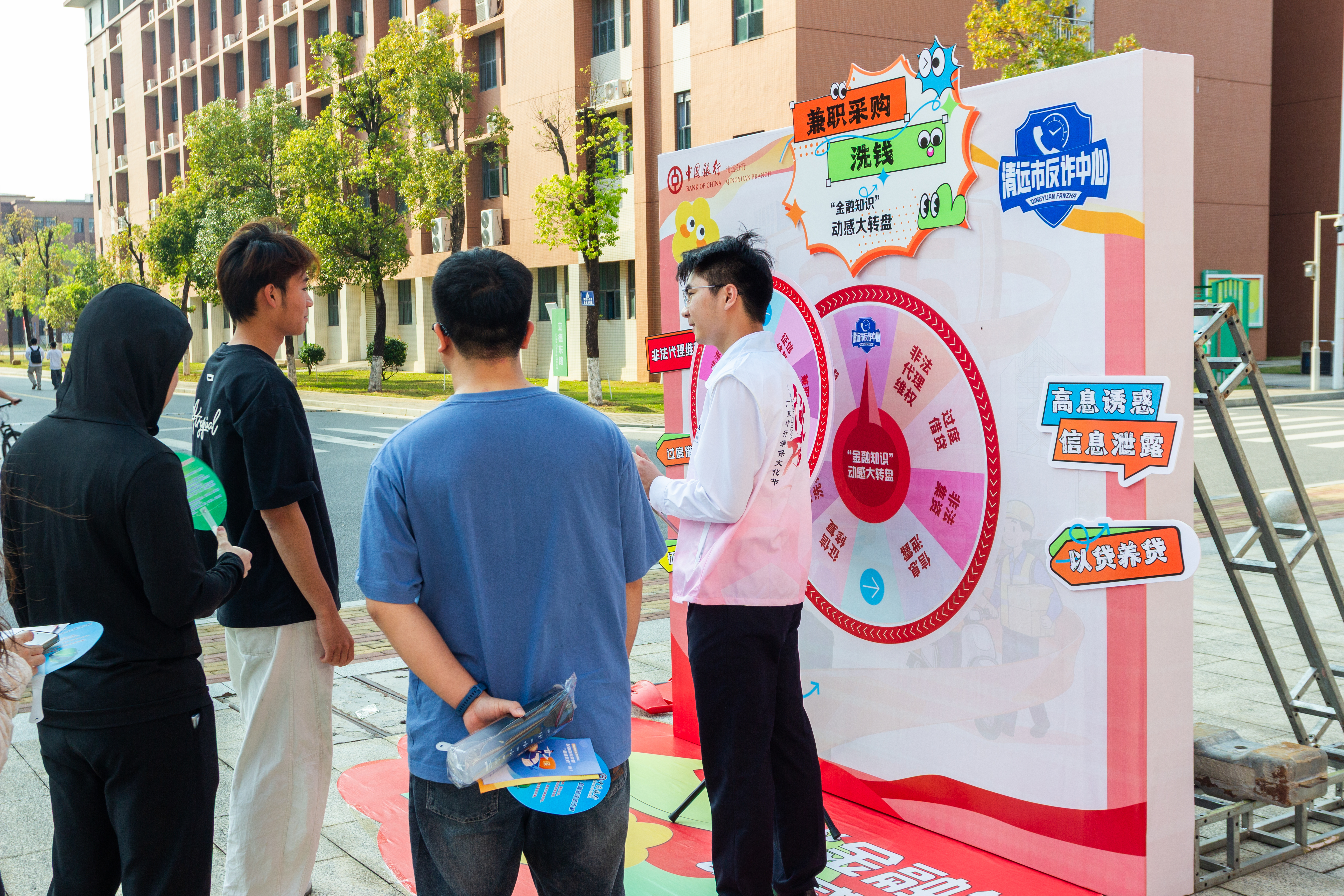 活动期间,中国银行清远分行的宣教人员与学校学生志愿者们身着统一马甲,耐心讲解、热情引导,用实际行动践行“金融为民”的初心使命。清远市反诈骗中心宣讲员、职教城派出所民警也来到现场,结合真实案例与学生们面对面交流,进一步强化了反诈宣传效果。